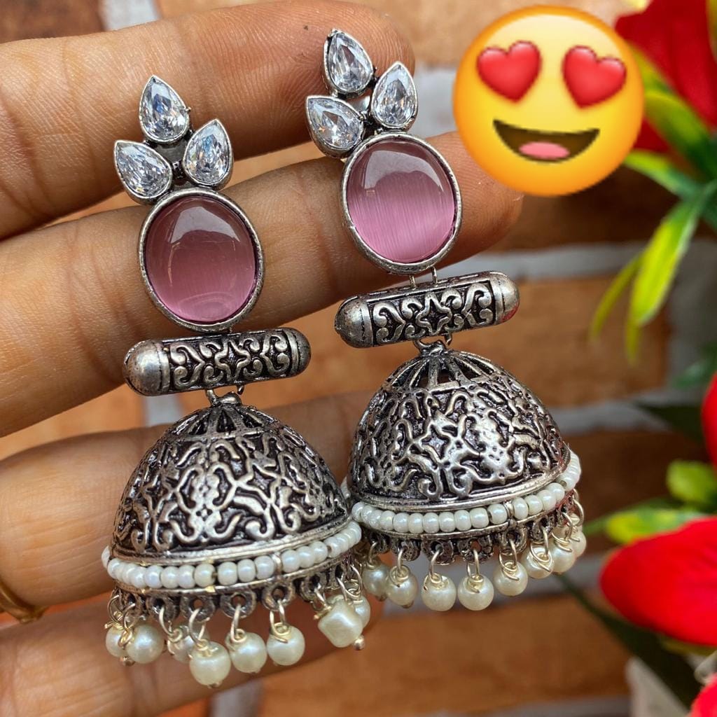 Traditional oxidize earrings with dools with pink stone,all time unique on western as well as traditional drawings..