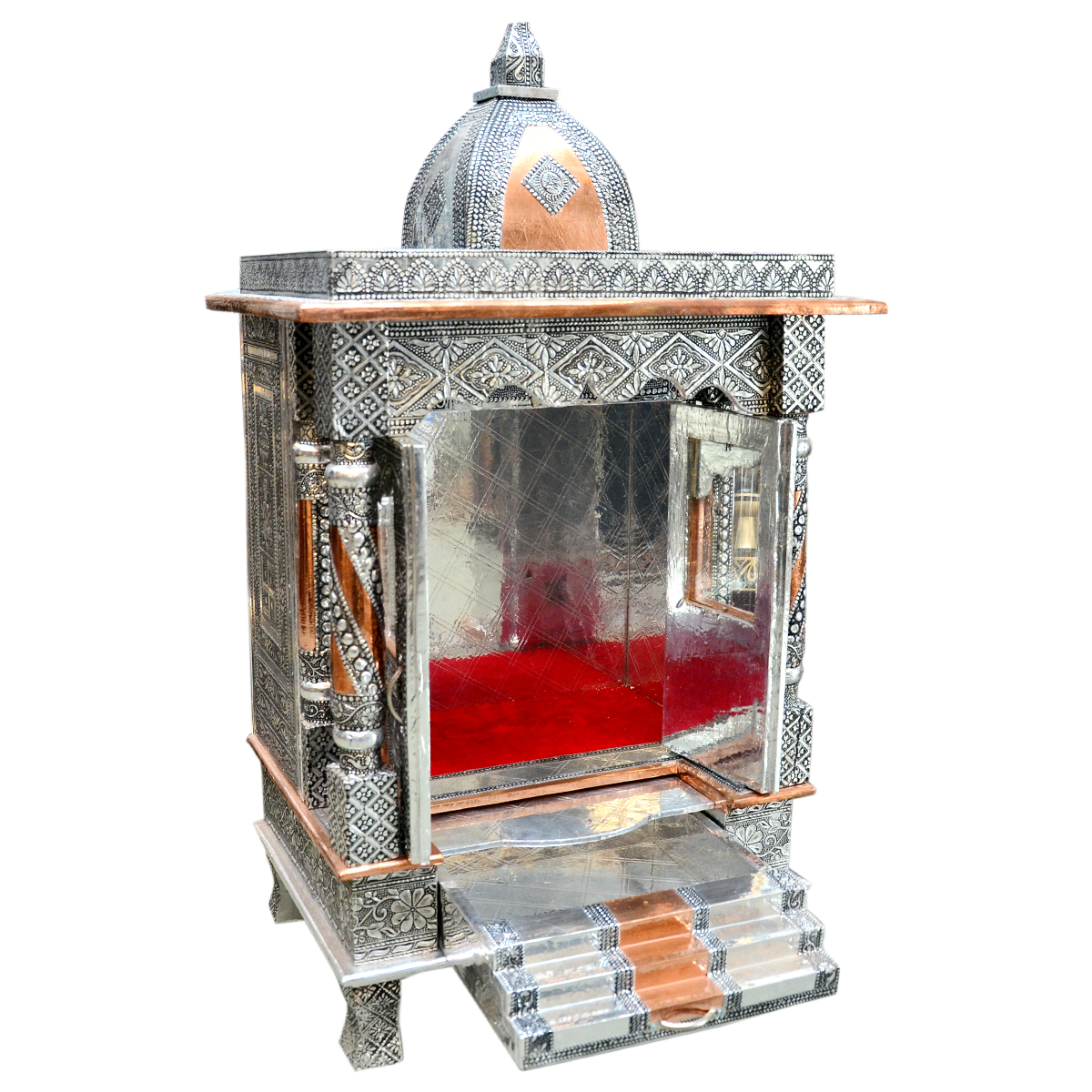 Attributes : Oxidize mandir ,with wall mount option ,having drawer with steps and sliding board for diya ..decorative 1 brass look round  ghoomat on top.