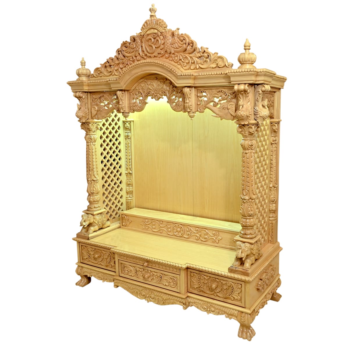 Attributes: This temple is 100% hand carving, and covered with long-lasting shining polish. It also has a carved top  & side net design, with a beautiful carving , gives lovely look to the temple. With a big om design on the top center, it symbolizes the rooted culture of Hinduism. Even Two pillars with elephant design give a marvellous majestic look to the temple. Three drawers are designed and designated for pooja accessories. Even there is a Desk for diva and food the god. We also give our lovely customers, LED light fitting inside to brighten the pooja place.