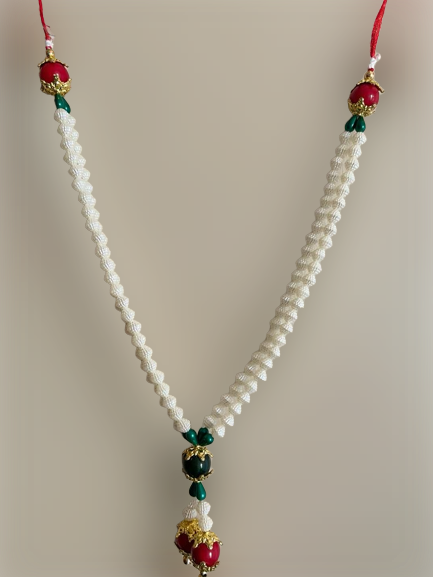Garland with white beads, plus red, & green combination pendant looks simple and beautiful on any idol or photograph,.
